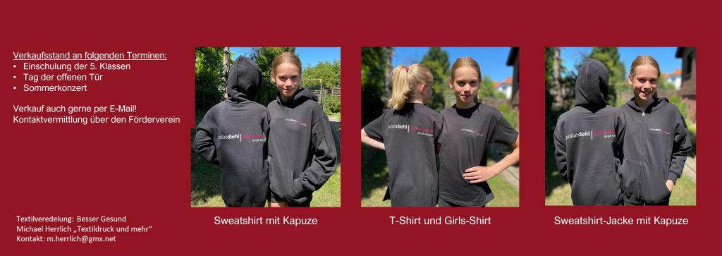 Wir bieten zwei Formen von T-Shirts an, einmal mit geradem Schnitt und einmal etwas tailliert („Girls-Shirt“). Zum Überziehen gibt es Sweatshirts mit Bauchtasche und Kapuze oder Sweatshirt-Jacken mit Kapuze. Das Logo der Schule ist klein auf der Vorderseite und groß auf dem Rücken aufgedruckt.